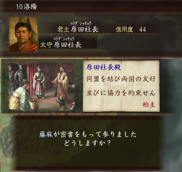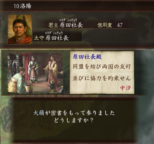 国の治安や武将の能力が高いと、その国に来る(または通る)使者を捕らえて、どうするか決めることができます。