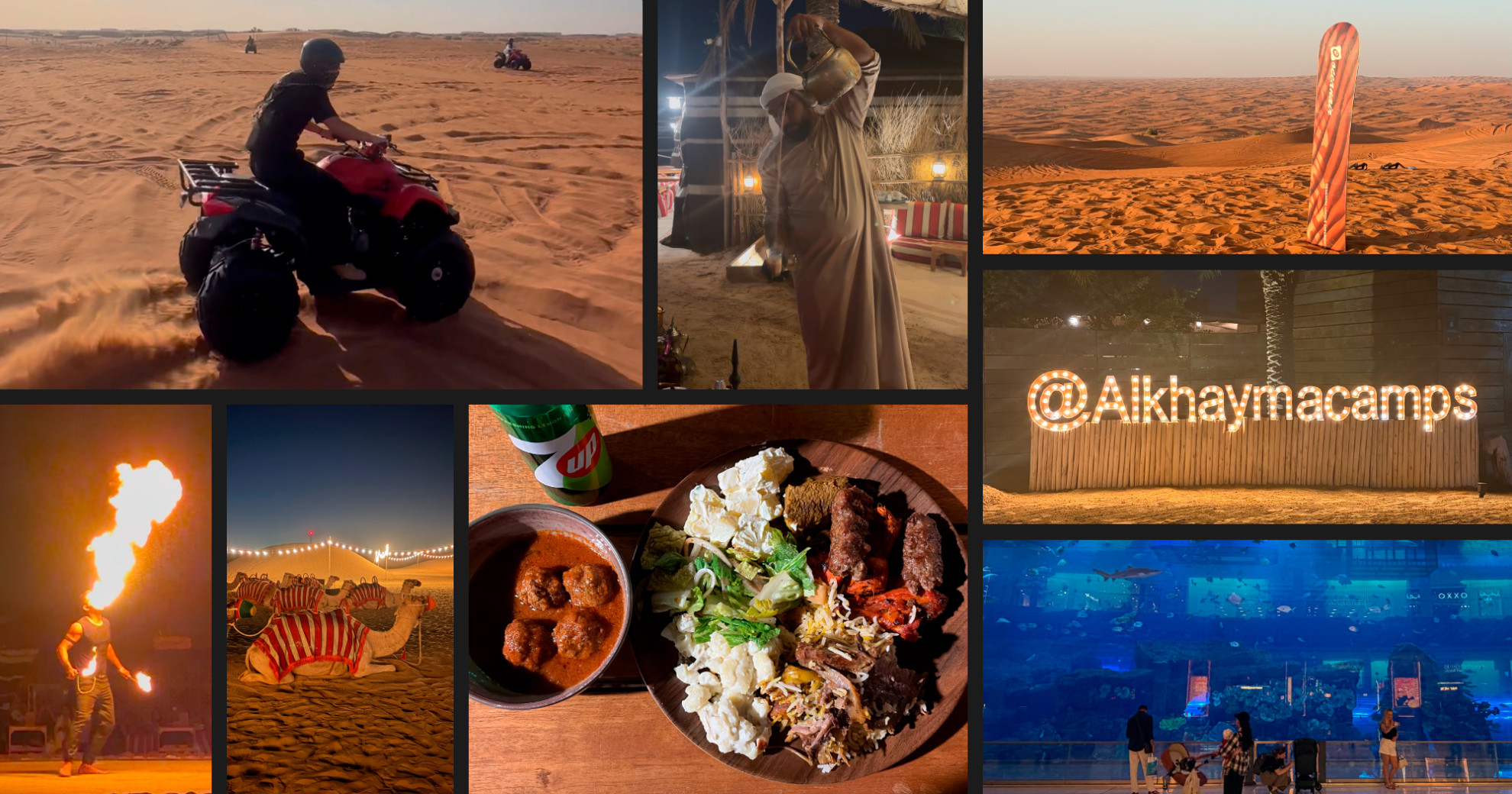 夜は砂漠の中のキャンプ施設でご飯を食べながらファイアショーを見たり、ヘナタトゥーやシーシャ、アラビアコーヒーなどドバイの文化を楽しんできました!ご飯はラム肉や牛肉がメインで肉々しくておいしかったです。パクチーが効いてる料理もあったので、好き嫌い別れそうな感じでした。
