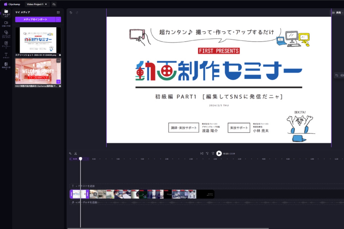 動画制作が初めての方向けに、無料で使える動画編集ソフトClipchampを使った基本的な動画編集方法を学べるセミナーです。パソコンがあればどなたでも手軽に動画制作を始めることができます。